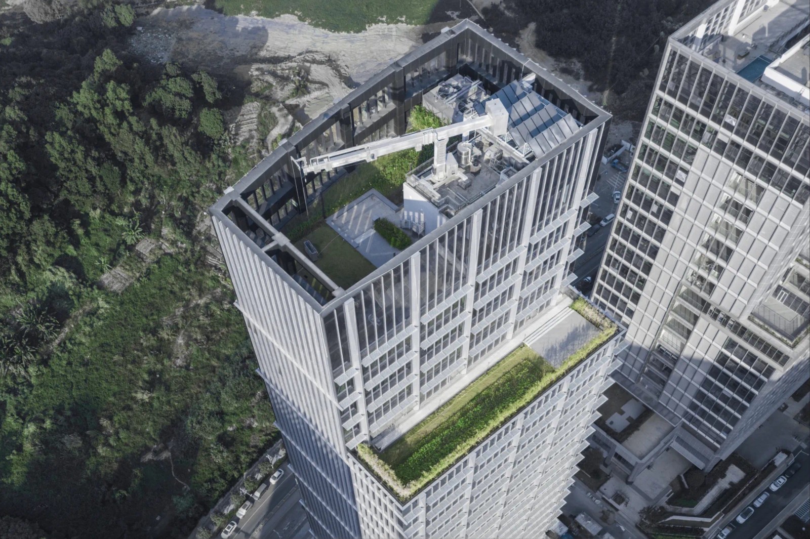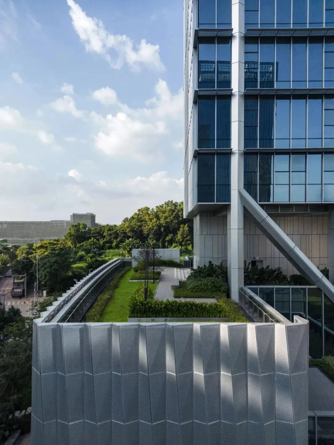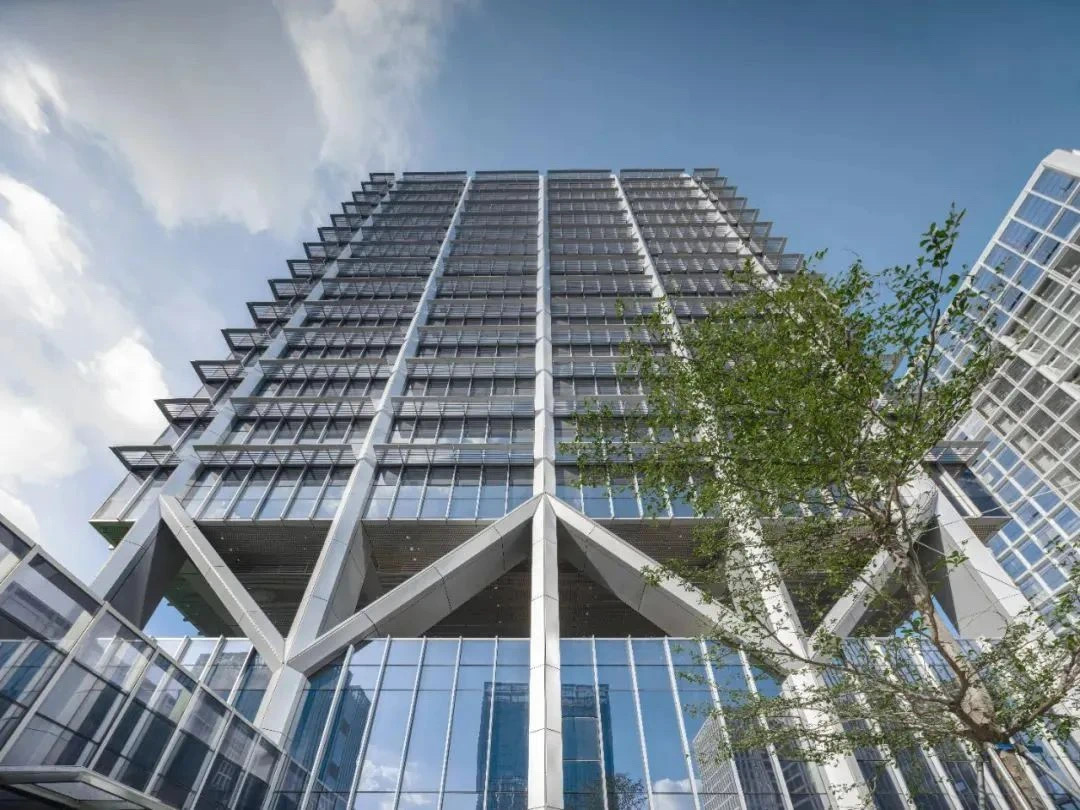 大厦在外立面设计上采用塔楼结构突出外立面的设计方式,使得塔楼内部形成无柱空间,极具辨识度。三种立面塔楼遮阳设计环绕大楼不同立面形成富有韵律、独特且连续的特色肌理,并为每个办公楼层都提供了绝佳的景观视野。除每层的阳台之外,室外景观覆盖四季常绿的草地与灌木,木制活动平台与休憩空间成为可以参观、交流和休憩空中公共层,整体贯彻节能理念。